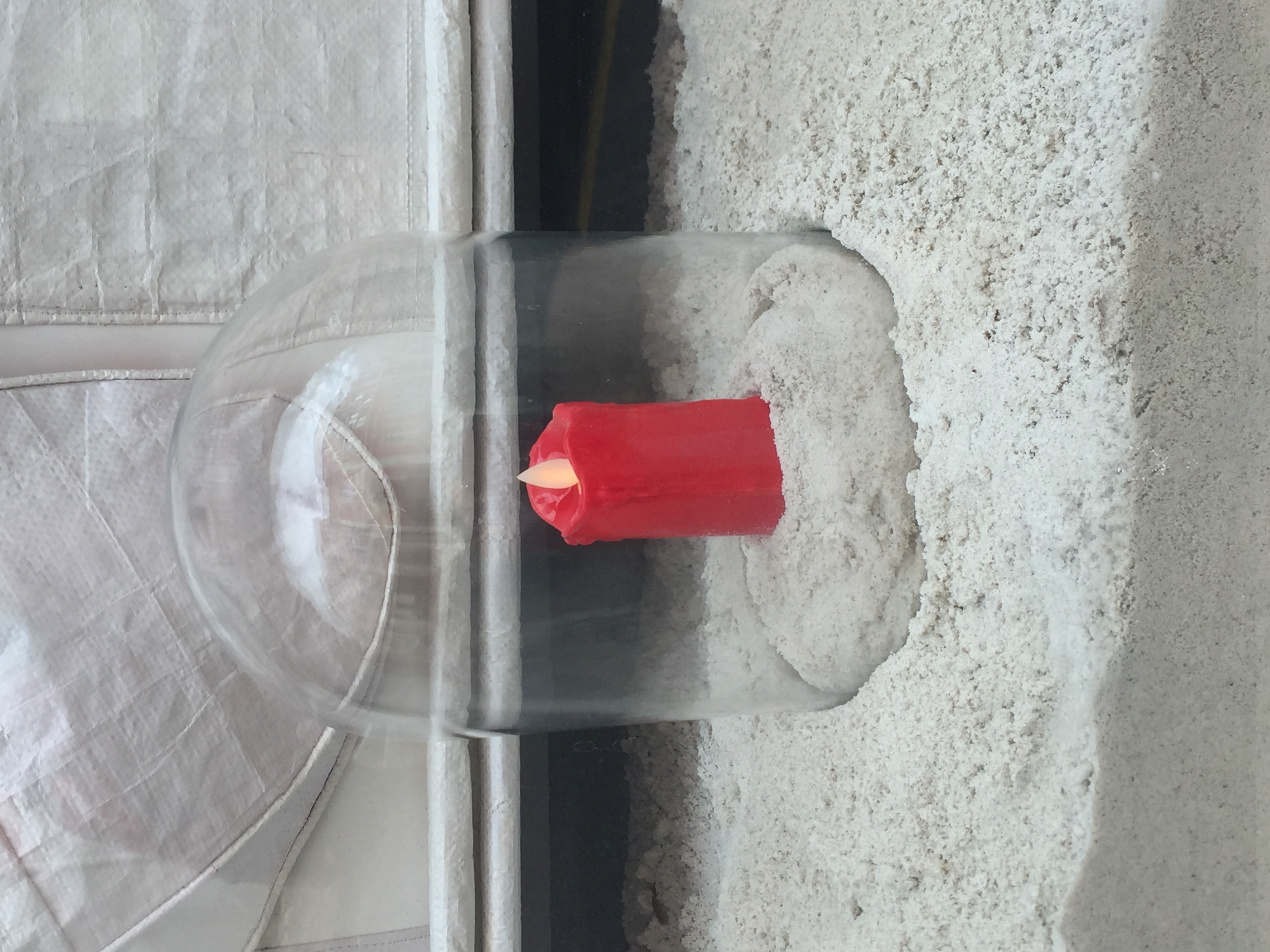 O vento soprou e cobriu de areia o fogo, calando toda a humanidade. Acendeu-se então outro fogo, de tipo frio, contido, inofensivo, inexpressivo, sensível a qualquer queda de energia ou arriar de bateria. A eletricidade trai o fogo que a gerou. O fogo que com a areia faz o vidro e com o petróleo faz o plástico; a vitrine que vê e é vista, transparência e reflexo; a relatividade que cinde o átomo e expande o universo. A artesania das tramas do cesto do supermercado, fundida em material petrolato, encontram as mãos de um cortar e coser demorado. A máquina de costura conforma um estandarte, opera símbolos, laça a linha na agulha e avança a 150 cavalos. A instalação "Grão de areia plástico bolha", que conta com a concepção de Duda Affonso e a confecção do estandarte pela artista convidada Rafaela Salgueiro narra, de maneira figurativa e simbólica, o trajeto entre modernidade e pós-modernidade através de materiais icônicos: o vidro e o plástico.